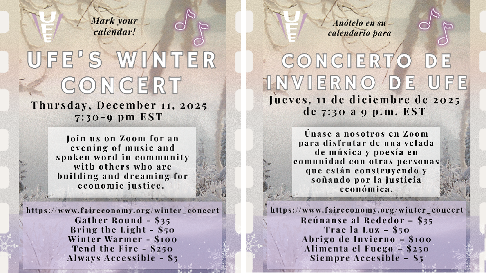 Support the movement for economic justice with a concert and spoken word performance. Apoye el movimiento por la justicia económica con un concierto y una presentación de palabra hablada.