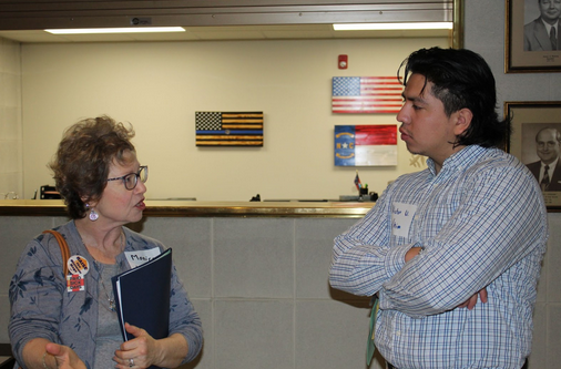 Monia Lavery, advocate for paid sick leave and family leave for nursing home staff, talking with UFE’s Victor Urquiza