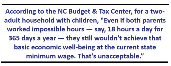 Del mismo modo, por tercera sesión consecutiva - seis años y contando - los legisladores que trabajan junto a Raising Wages NC están presentando un proyecto de ley para establecer un aumento del salario mínimo global e inclusivo. Sin embargo, mientras el costo de la vida sube, los trabajadores peor pagados de Carolina del Norte siguen estancados en $7.25 dólares con veinticinco centavos la hora, el mismo salario desde 2009.