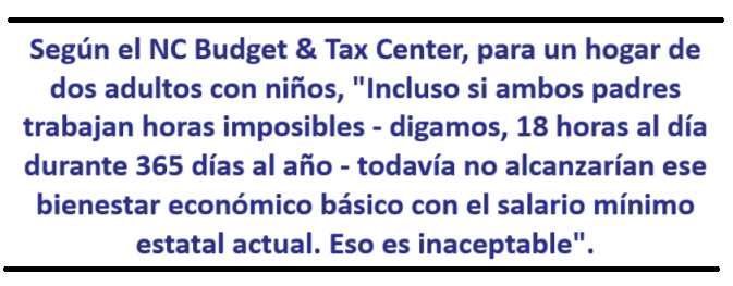 El Día de Acción llegó en un momento importante. El salario mínimo de Carolina del Norte se ha mantenido congelado en $7.25 dólares y veinticinco centavos la hora, y en sólo $2.13 dólares y trece centavos para los trabajadores que reciben propinas, desde 2009. Mientras tanto, el Estándar de Ingreso Vital de Carolina del Norte de 2025 muestra que un padre soltero con un hijo necesita $36.30 dólares con treinta centavos por hora para cubrir sólo las necesidades básicas. Según el NC Budget & Tax Center, para un hogar de dos adultos con niños, "Incluso si ambos padres trabajan horas imposibles - digamos, 18 horas al día durante 365 días al año - todavía no alcanzarían ese bienestar económico básico con el salario mínimo estatal actual. Eso es inaceptable".