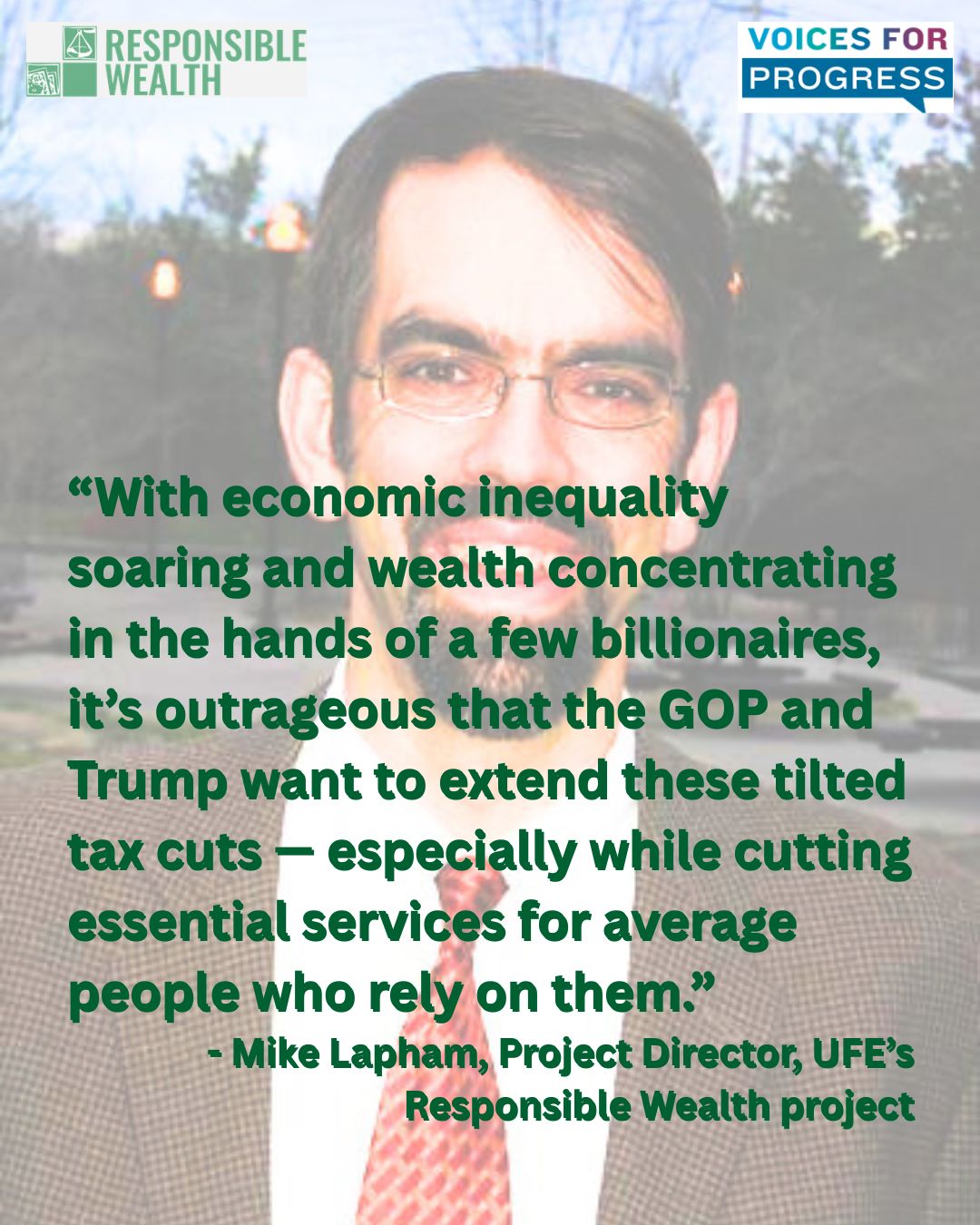 Mike Lapham, UFE's Deputy Director and Responsible Wealth (RW) Program Director, collaborated with RW members and Voices for Progress to oppose the latest effort to concentrate more resources in fewer hands.