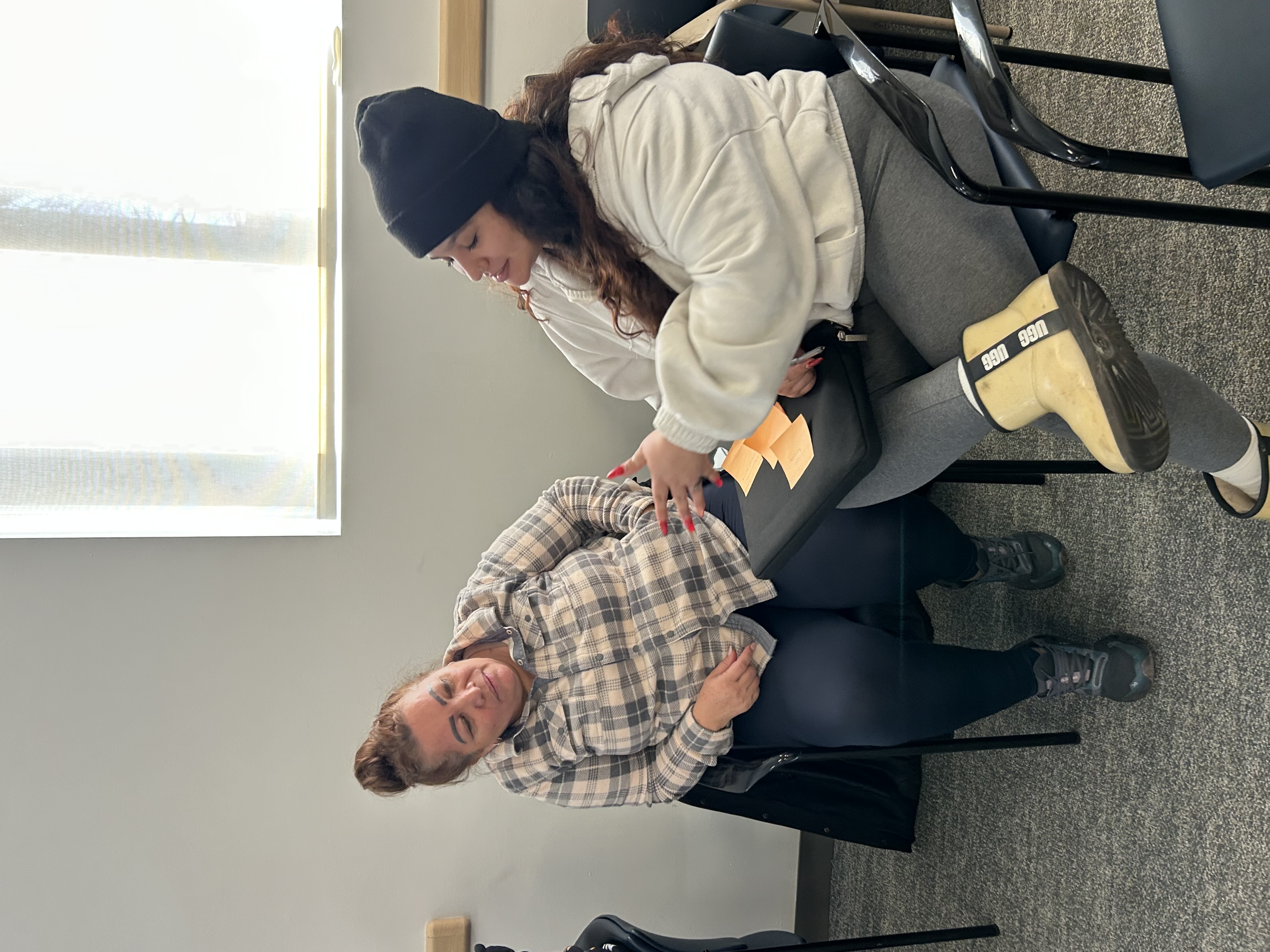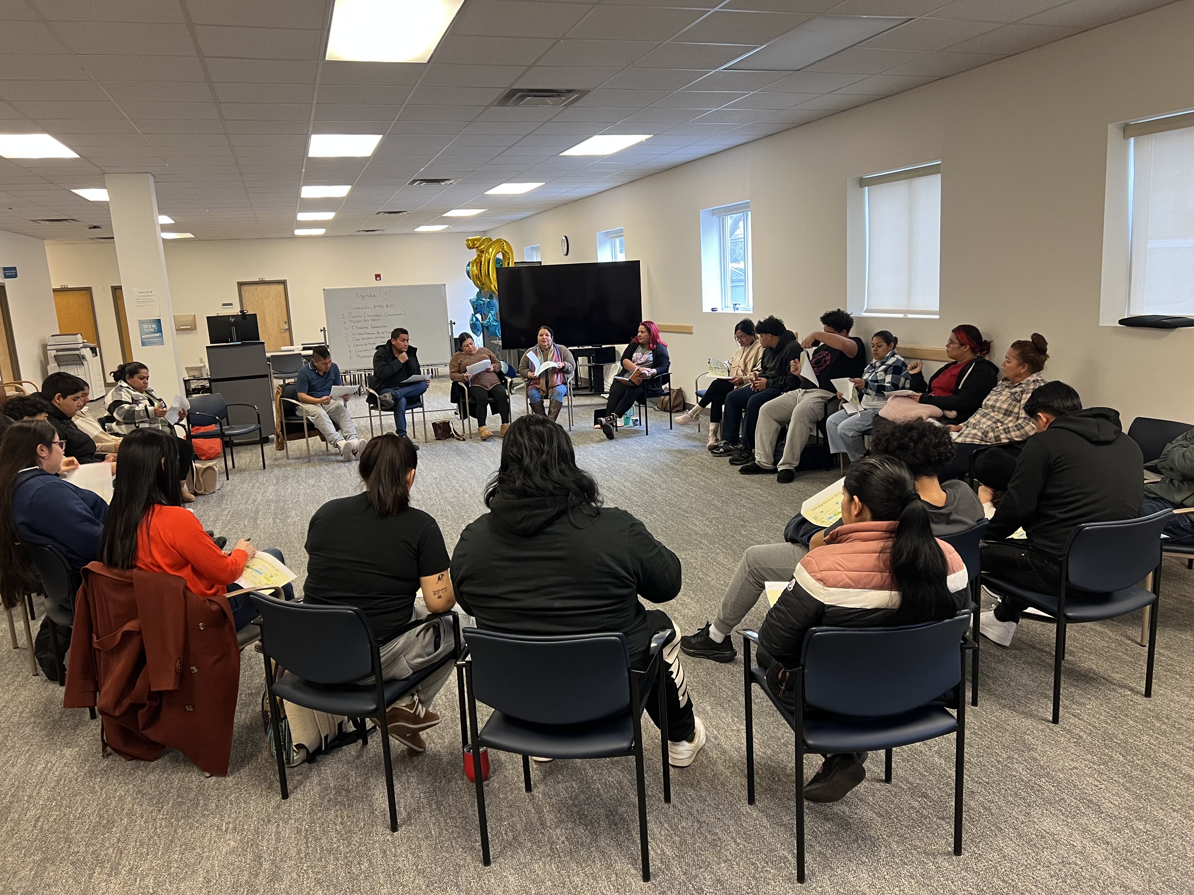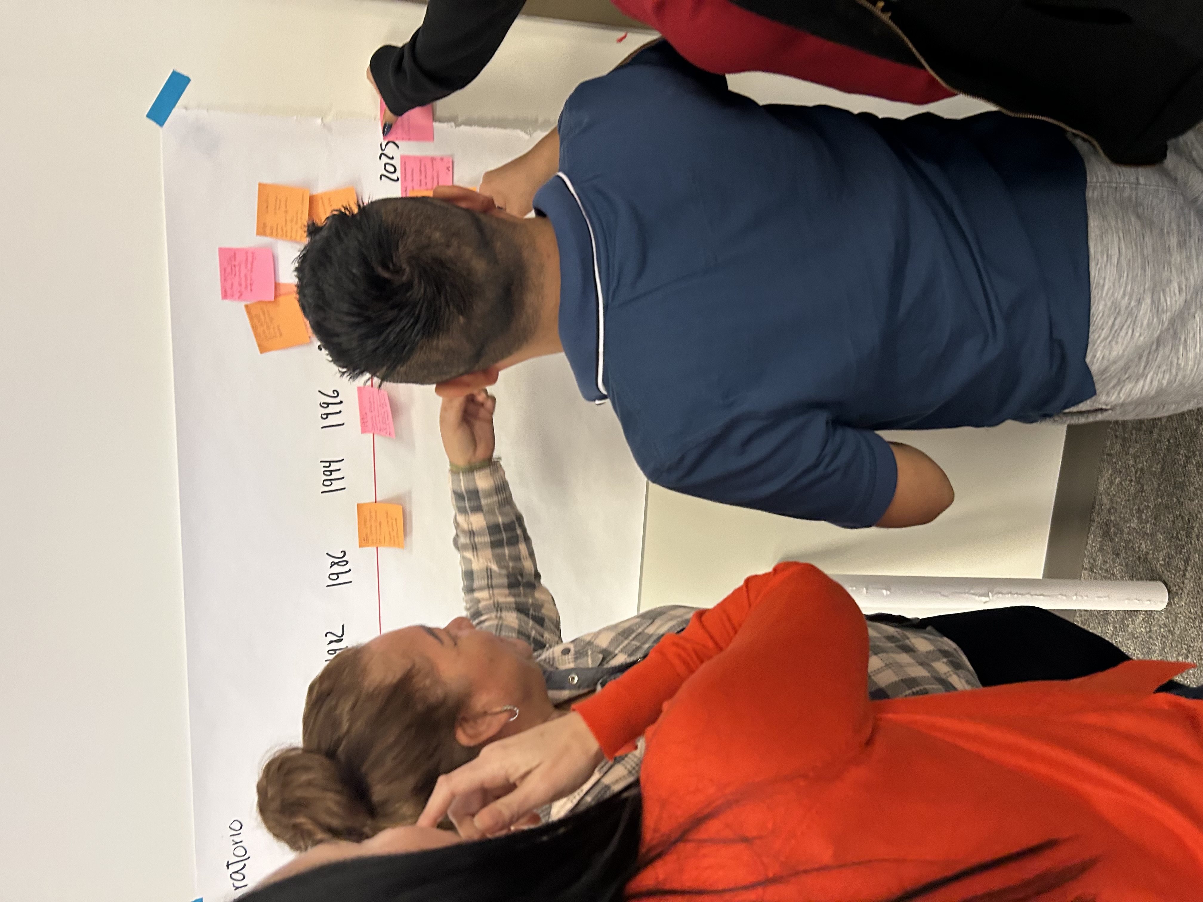Luego facilitamos una actividad llamada “El rostro humano de la inmigración”, en la que los participantes trabajaron en parejas, hablando sobre sus propias historias de migración o las de sus familias, y sobre por qué las personas migran a los EE. UU., usando notas adhesivas para escribir palabras clave sobre el motivo de la migración, el país y el año. Después, colocaron estas notas en una línea de tiempo.