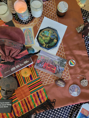 Items placed on the shared altar One image has text reading “Defend the Sacred”