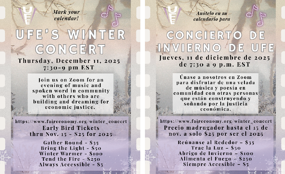 Apoye el movimiento por la justicia económica con un concierto y una presentación de palabra hablada. ¡Únase a nosotros el jueves, 11 de Diciembre de 2025 de 7:30 a 9 p.m. EST, para disfrutar de una velada de música y poesía.